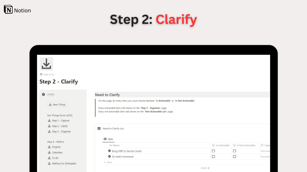 2. Clarify: Review and process everything you’ve collected in your inboxes. This means you have to decide where things belong in the Getting Things Done system.
